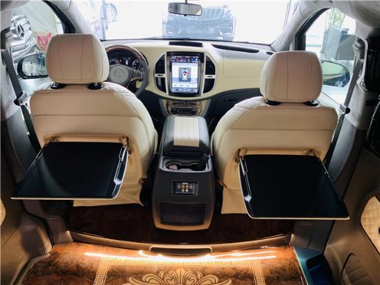 踏入后舱立刻就会被它的豪华绚丽而征服,整车环保真皮包裹,激光复刻实木地板铺设,豪华感无处不在。2019款奔驰威霆后排座椅采用S级豪华电动一键式展开记忆功能首长席座椅(加热 通风 按摩)180旋转,后排三联排座椅,中间隐藏着中央扶手箱,内置有全彩触控屏,使得后排贵宾也能自如的操控车上的功能。一键放平靠背,车舱内又能惊现出一张双人床来。最大限度的减缓您的乘车疲惫。高顶安装迈巴赫九宫格顶灯,全车光纤氛围灯营造宁静安详的休息氛围,高档电动调节对开天鹅绒窗帘,进口珍稀虎斑檀木航空铝制地板,四季实用环保透明地膜