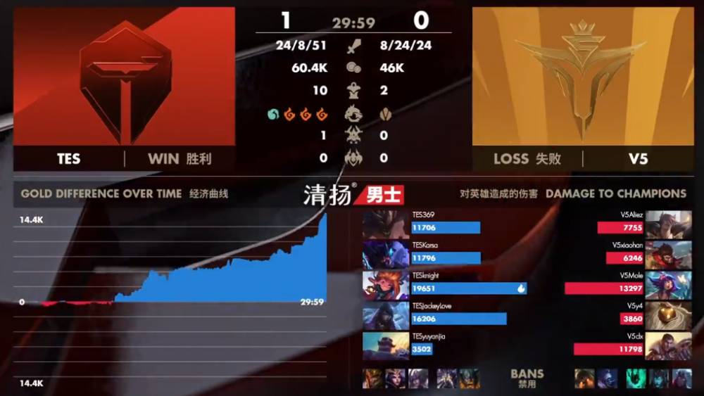 【14:50】中路V5抓到厄斐琉斯的机会全员压上,虽然最终将厄斐琉斯击杀,但是交出太多的技能被TES反打,TES石头人后续进场配合队友打出一换四;