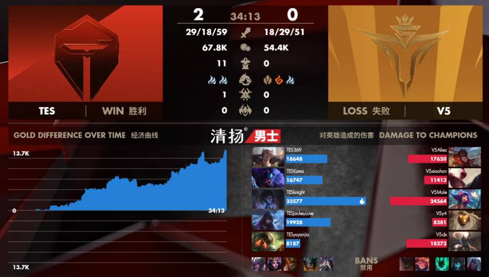 4月13日讯 LPL春季赛第七周第一比赛日,第三场比赛由TES迎战V5。TES目前取得八胜五负,V5零胜十三负早早脱离了季后赛争夺。