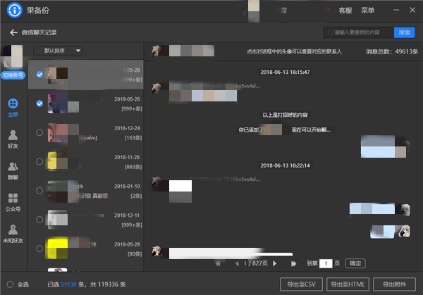 完成后我们可以选择不同的数据项进行查看,在这里我们以微信聊天记录为例,点击“微信聊天记录”进入后,除了预览备份好的数据,还可以勾选需要的聊天记录,再在右下角选择需要的格式将数据导出。