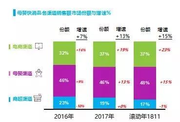 婴儿纸尿裤属于快速消费品,目前主要在商超渠道、电商渠道和母婴渠道销售。根据尼尔森发布的《中国婴幼儿快消品新趋势》显示,母婴快消品中电商渠道增速较快2018年占比为37%,同比上升23%;其次母婴渠道占比48%,同比上升15%,线下商超渠道则呈现萎缩状态。