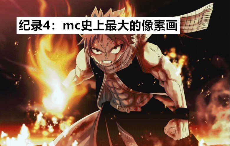 我的世界创造的最大像素艺术作品是由1,988,532个方块制作而成,像素画的主角来自《妖精的尾巴》中的人物斯汀·尤克利夫。由来自澳大利亚的玩家Mysticlloyd于2015年打造,2018年建成。