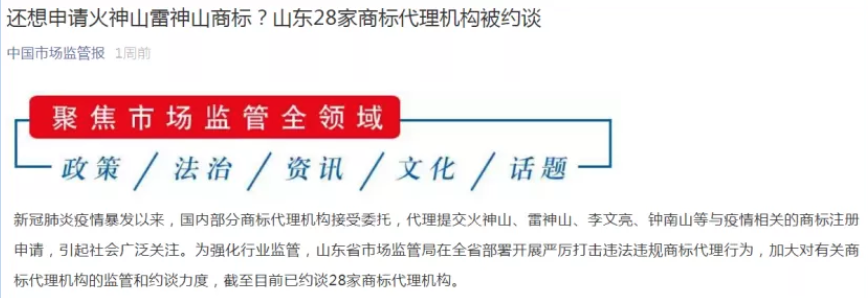 3月11日,中国市场监管报微信公众号发布《顶格处罚10万元!北京市朝阳区对抢注火神山商标的代理机构出手了》(超链接)一文。这是全国首个因帮助企业代理申请注册火神山商标被市场监管部门处罚的案例,当事人被处以10万元顶格罚款,在社会上引起强烈反响,《环球时报》《新京报》等媒体纷纷转发本报报道,众多网友为朝阳区市场监管局这一处罚点赞。