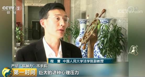 中国人民大学法学院副教授 程雷:比较典型的(网络)软暴力,就是通过网上这种,自己或者是雇佣他人来发帖发声,来进行恐吓,来进行这种威胁,以及诽谤侮辱他人,会给他人造成一种巨大的这种心理压力。