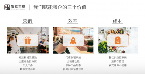 其中:银盒子智能营销系统,帮助商家打通线上线下会员体系,搭建私域流量池,千人千面精准营销;以智慧餐饮ERP、智能POS为主的银盒子收银系统,涵盖餐厅经营全链路功能,提高门店运营效率;此外,银盒子的餐饮供应链系统、进销存管理、食安溯源小程序,更帮助餐饮企业节约供应链运营成本,保障食品安全。
