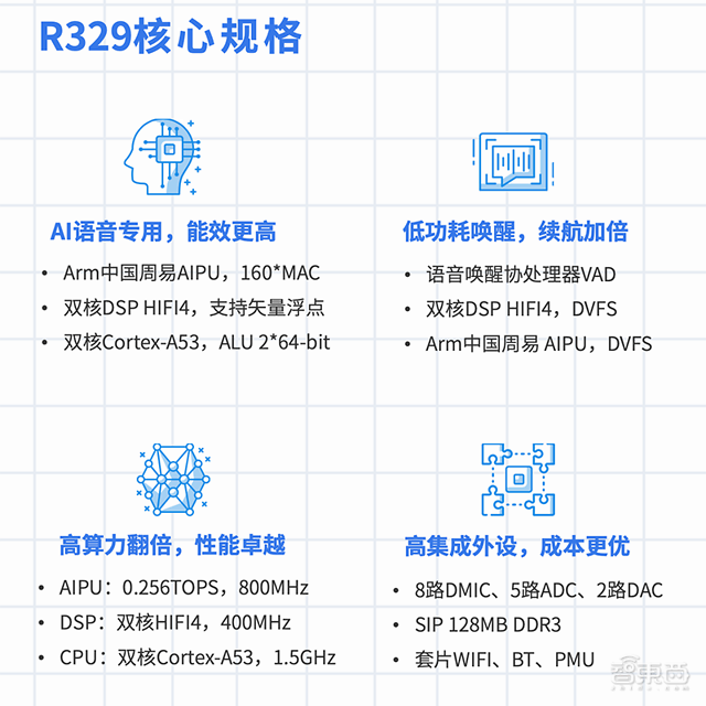 R329搭载“周易”AIPU,拥有0.256TOPS算力,800MHz频率,能够使用深度学习进行端到端的算法,进一步提升AI语音的识别率和交互体验。