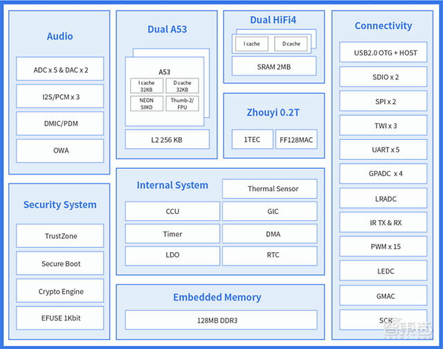 作为一款多核异构处理器,R329还集成了主频为1.5GHz的双核Arm Cortex-A53,使R329的整数算力比上一代R328芯片高出1.58倍,浮点算力高1.94倍;其DSP为400MHz的双核HIFI4,拥有HIFi级算法,能够进行音频前、后处理,提升音质效果。