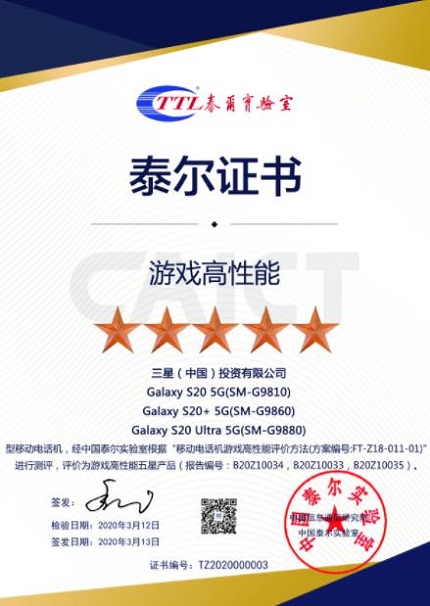 而如果光看参数还不足以证明三星Galaxy S20 5G系列的强悍,那么针对智能手机游戏性能,中国泰尔实验室还提供了专业的评测项目。针对三星全新机型Galaxy S20 5G系列,中国泰尔实验室进行了全面评测,结果表示三款手机在屏幕蓝光防护能力、高强度游戏测试场景下流畅度方面均有优异表现,达到了“游戏高性能五星级产品”的评价等级,并获得了“泰尔证书-游戏高性能”五星证书。