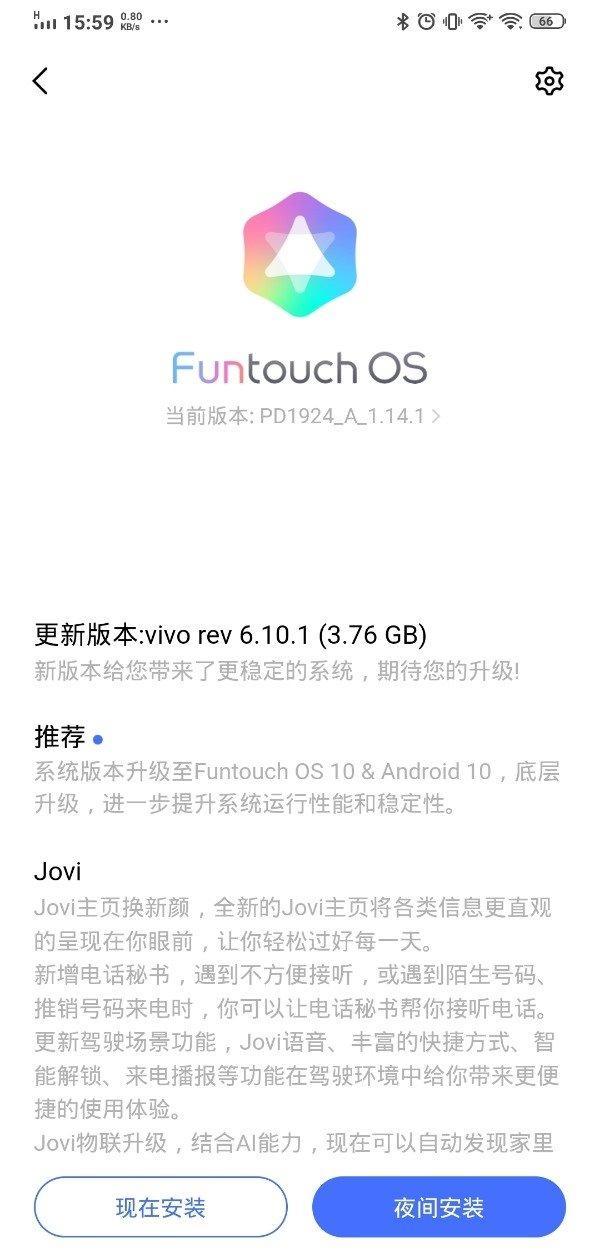 而在最近,这款vivo NEX 3 5G 手机也是迎来了Funtouch OS 10的正式版系统更新推送宝,此次更新的内部版本号为PD1924_A_1.14.1,更新包的大小也是达到了7.76G。