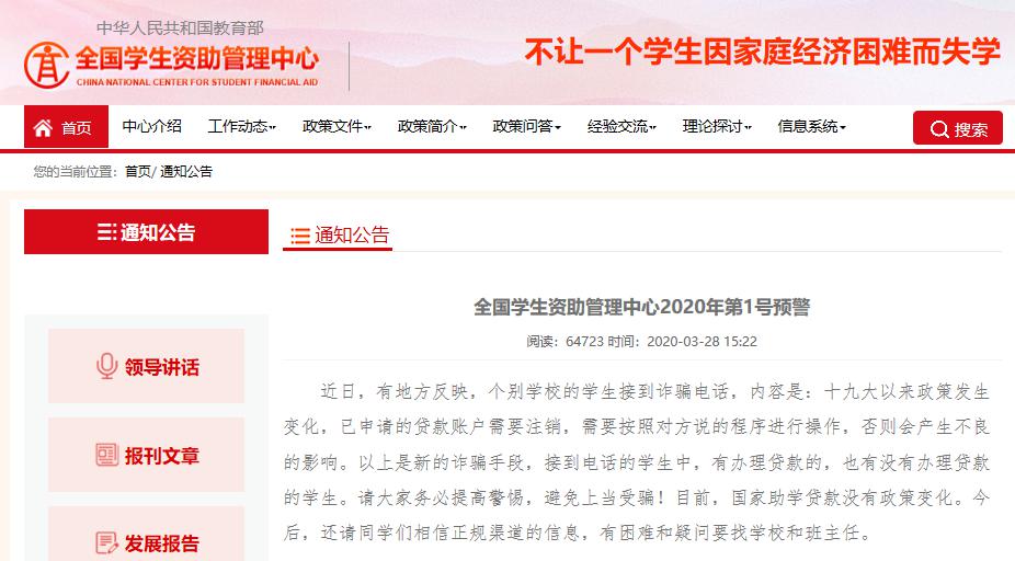 近期,教育部全国学生资助管理中心发布2020年第1号预警,就近来“部分学生接到‘注销助学贷款账户’电话,恐吓学生不注销则会产生不良影响”事件预警:目前,国家助学贷款没有政策变化,学生群体切勿轻信上当。全国多所高校也发布提醒,提示学生谨防此类骗局。