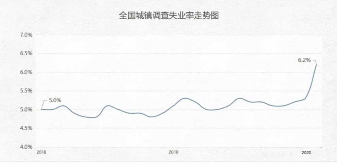 2020年,大学应届毕业生达到874万,再创历史新高。与此同时,国家统计局披露的2月份国内失业率为6.2%,较2019年同期的5.3%增加了近1%。