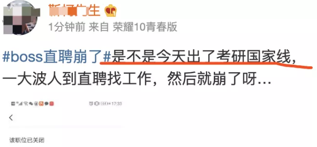 有人分析boss直聘崩盘出现在研究生成绩公布之后,怀疑是研究生考试失败的莘莘学子们在boss上发生了“踩踏”。