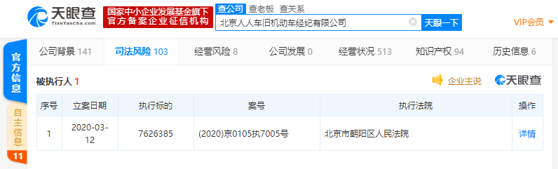【环球网综合报道】天眼查数据显示,3月12日,北京人人车旧机动车经纪有限公司被列为被执行人,执行标的为7626385,执行法院为北京市朝阳区人民法院。值得注意的是,这并不是人人车关联公司第一次被执行人,早在今年1月和2月,人人车另外一家关联公司北京善义善美科技有限公司就三次被列为被执行人,累计执行标的为2923627。