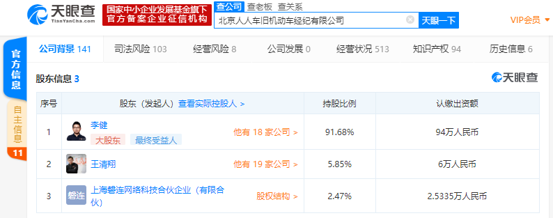 天眼查股东信息显示,该公司最大股东为人人车创始人兼CEO李建,持股比例为91.68%,第二大股东为人人车联合创始人王清翔,持股比例为5.85%。