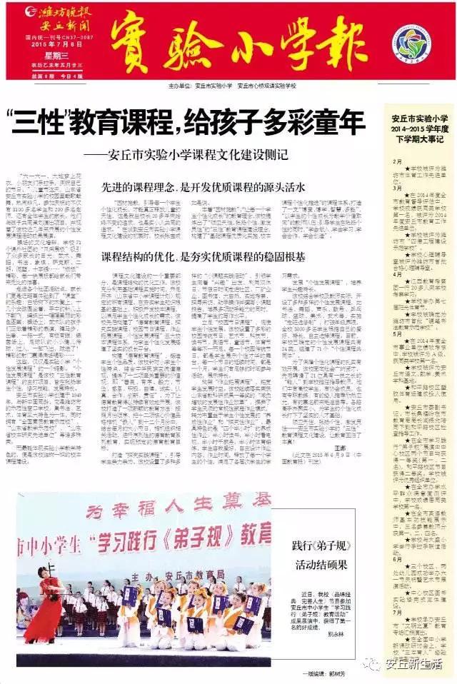2、2015年6月,安丘市硬笔书法家协会筹委会主任韩风年,应邀为安丘市实验小学和育英中学题写报头。