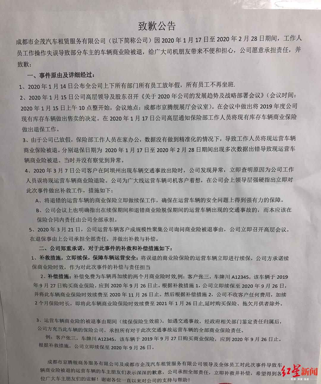 对将租赁出去的车辆商业险退掉的情况,3月24日,成都市京腾舰商务服务有限公司办公大厅内贴出了一张致歉公告,上面对3月份阿坝州一司机在发生交通事故后,发现车辆商业险被退一事予以了证实。公告中称,公司在今年一月中旬决定,将2019年度的库存车辆出售,于是在今年1月17日,通知保险部门工作人员将现有库存车辆商业险进行退保。由于公司已经放假,保险部工作人员在家办公,数据没有做到精准化的情况下,导致工作人员将现运营车辆商业险进行了退保。退保日期在1月17日到2月28日期间,当时并没有察觉到异常。