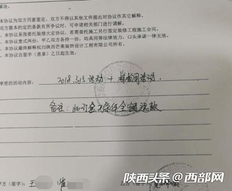 网友“深秋”表示,2018年3月,他在西安芒果装饰装修公司业务人员及设计师的推荐下,签订了“委托装修大定协议”,协议备注写明了“此订金无条件全额退款”。之后因为家中变故,房屋不打算装修了,但公司一直推辞退费,“从去年8月初开始找,都是一个推一个,最后谁也不管”。