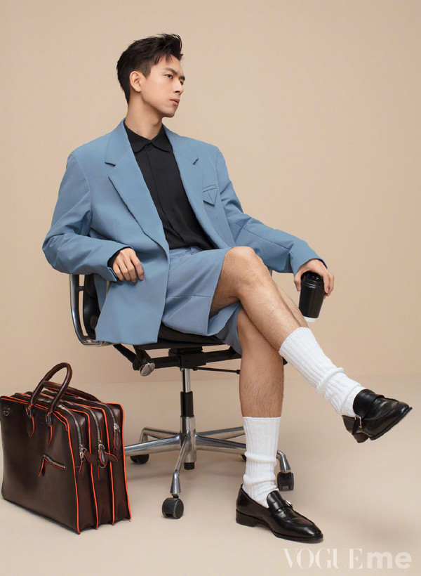 要说这套西装走的是常见的正式严谨路线就大错特错了,下身的短裤搭配实在太跳脱了。同色系的短裤刚刚及到膝盖位置,虽是同样的西裤材质,但是却没有任何西裤的正式,露出一大截结实的腿部肌肉,连袜子都是休闲风的运动长袜,混搭风的西装造型趣味感十足。