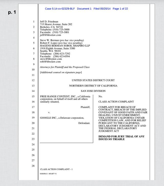 Free Range公司认为谷歌的行为违反了Google AdSense发布商协议中的有关条款,并违反了推定适用的诚实信用和公平交易原则,因此委托律师联合其他在2010年5月20日到2018年5月7日之间被谷歌终止或解除了AdSense账户,永久扣除了全部未支付金额,以及被扣除的金额超过10美元的企业,共同发起集体诉讼。诉讼集团和谷歌最终在2018年5月达成了总金额为1100万美元的和解协议。