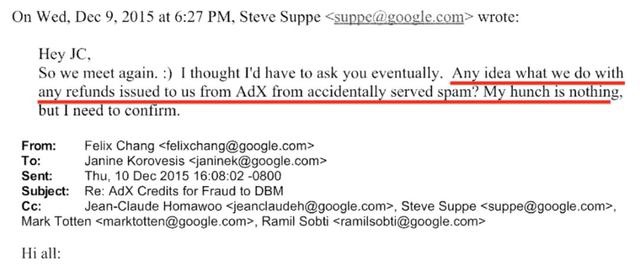 在这个案件中,令业界较为震惊的是流出的大量内部邮件证据证实了,谷歌确实没有在第一时间妥善处理因封停发布商广告而罚没的款项,并没有按销售人员所承诺的那样及时将这些款项返还到广告主手中。