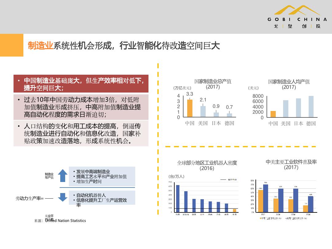 首先,中国制造业的基础特别庞大,生产效率相比于海外的欧美发达国家和地区比较大型的规模化制造业来说,效率还是略显低下,所以提升空间特别巨大。其次,过去10年,中国劳动力的成本也增加了三倍,对低附加值制造业形成了挤压,中高附加值制造业提高资本化程度的需求已经过期,此外,人口结构的变化和用工成本的提高,也倒逼着整个中国作为制造业大国进行自动化、信息化的改造。国家补贴政策也会加速改造落地,整个制造业已经形成了非常大的系统性机会。
