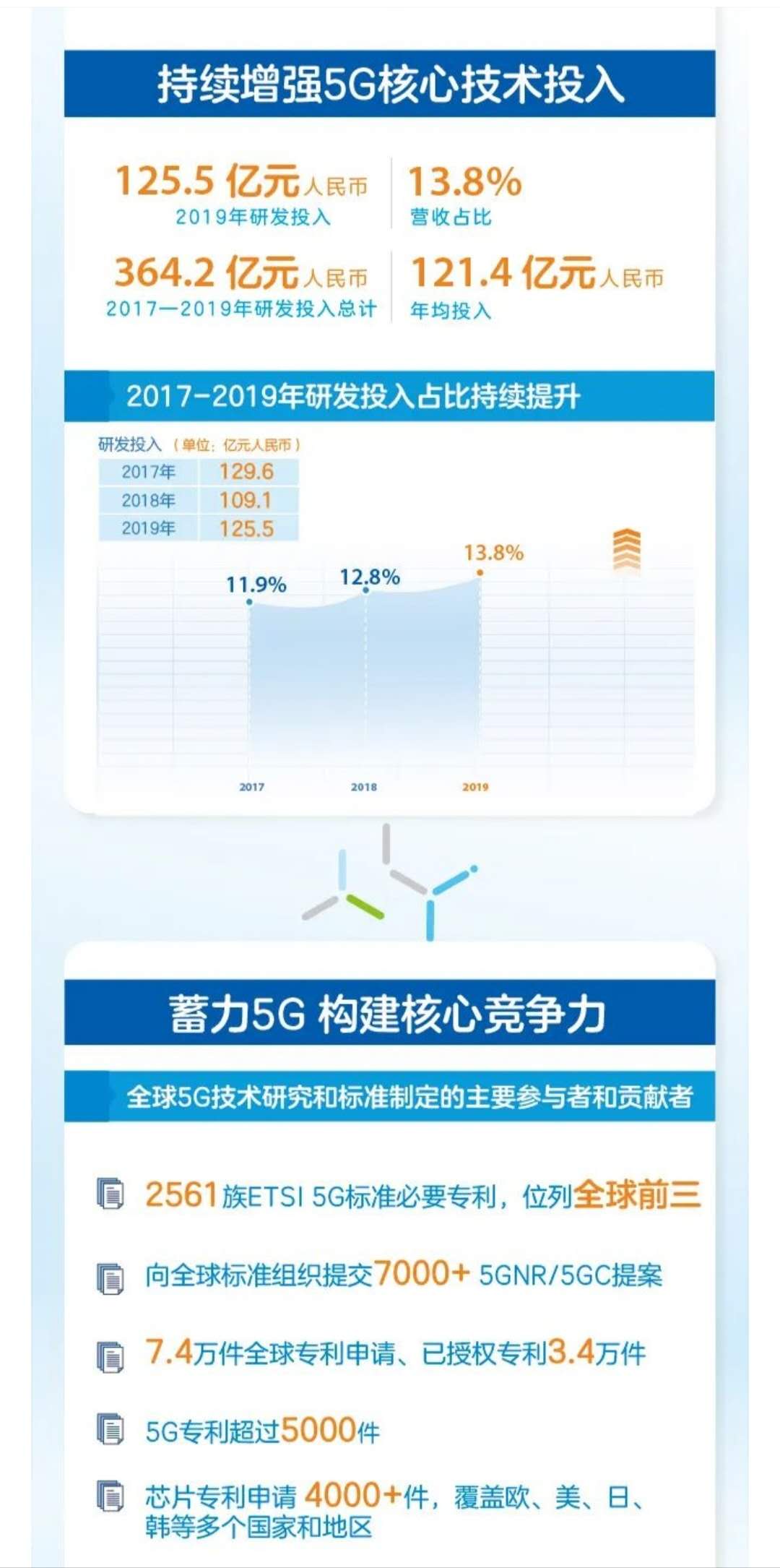在业界的领先地位离不开对研发的投入和重视,中兴通讯持续增强5G研发与投入,全年研发投入达125.5亿元人民币,占营业收入比例13.8%,较2018年的12.8%上升1个百分点。
