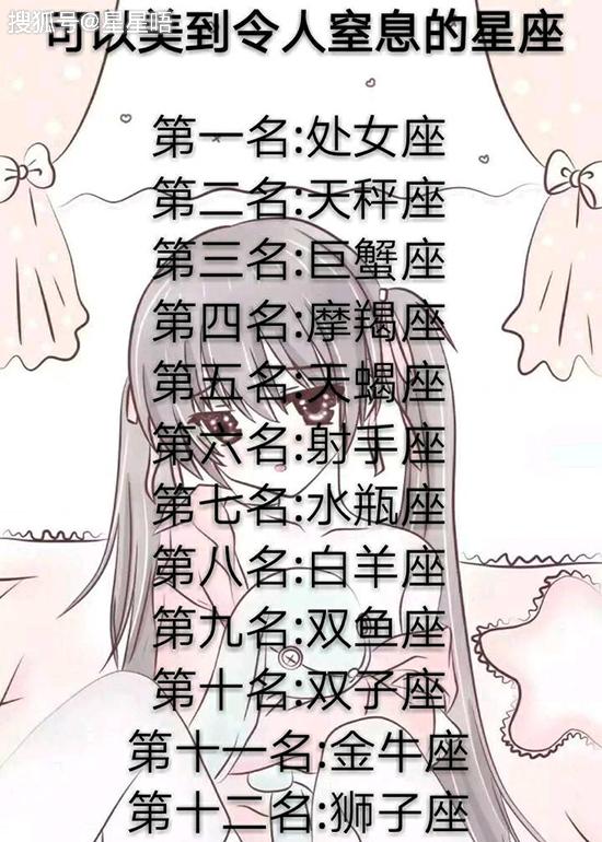 可以美到令人窒息的星座,第一名:处女座,第二名:天秤座,第三名:巨蟹座,第四名:摩羯座,第五名:天蝎座,第六名:射手座,第七名:水瓶座,第八名:白羊座,第九名:双鱼座,第十名:双子座,第十一名:金牛座,第十二名:狮子座。