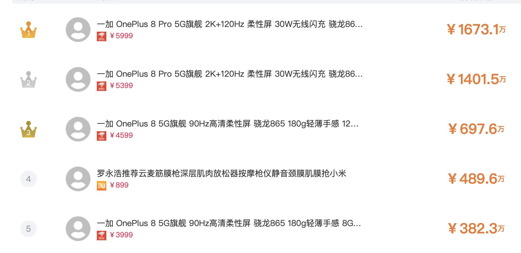 而且,从老罗第二场的数据来看,虽然出现了不可避免的下滑,但从趋势上到了一个相对稳定的位置。在一加8的带货直播中,也卖出了4000万元的成绩,成为了三场直播中卖得最好的产品,这还是没有折扣的销售额。