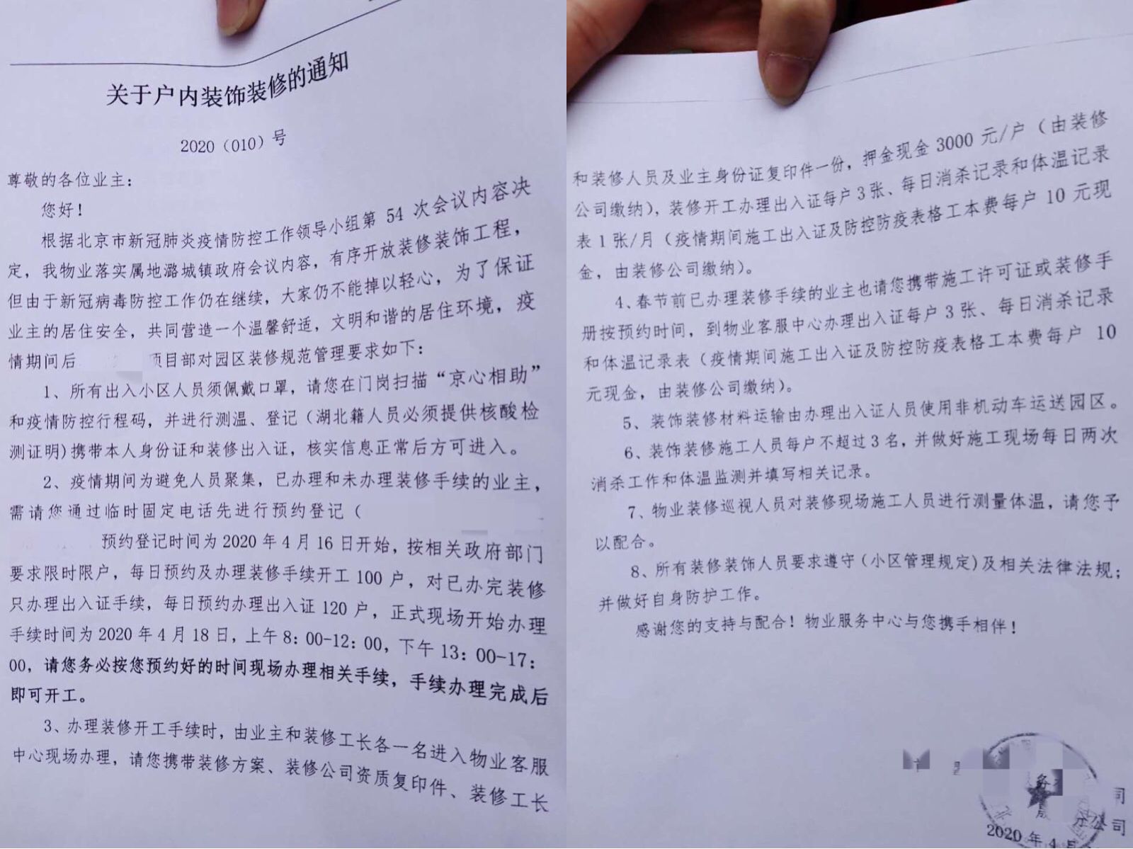 而据新京报记者了解,4月15日,装修业主江先生已经接到物业通知,其所在的通州后北营家园将有序开放装修装饰工程,“业主可于4月16日起,通过固定电话进行预约登记”。