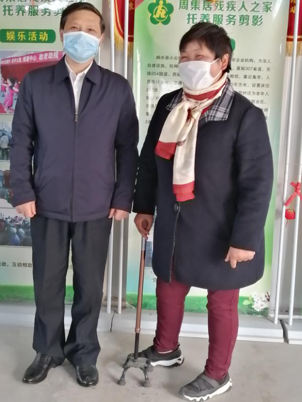 来到爱华残疾人之家,鞠理事长看到门口站着专门负责登记和体温检测的人员穿着防护服,戴着口罩与手套,房间里的十几个残疾人正在从事花艺类的辅助性劳动,他对机构负责人张爱华称赞说,你们的疫情防控工作做的很专业,我们残疾人是生活中的,自己做不好防护,关键要靠机构负责对他们的管理和防控,每一个残疾人服务机构安全与疫情防控麻痹不得,一样也不能放松。当他了解到机构负责人今年已经57岁的张爱华,虽肢体残疾要靠拄着拐杖走路,但她对照顾和托养老年人与残疾人十分热心,十几年前,拿着贷款投资创办起养老院,后来又创建了残疾人之家,目前拥有200张床位,先后接收了200多个老人照顾服侍,还有过40多个残疾人在这里托养,她的敬老助残感人事迹远近闻名,几年前就被表彰为全市十佳自强之星,还被评为响水好人等,凡来过这里的人都被她的事迹所感动并与她合影留念。临走时,看到热情开心的张爱华艰难地非要送大家,鞠理事长走到她身边说,感谢你为扶残助残做了贡献,今天我也与助残之星合个影,在大家的一片掌声中留下亲和暖心的照片。(蒋大勇楚海浪 夏月明)
