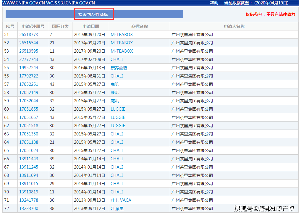 据了解,ChaLi茶里由谭琼创立于2013年,总部设在广州。茶里公司为“CHALI”系列商标的商标权人。根据中国商标网数据,截至目前,茶里公司共申请注册了72件商标,包括“CL茶里”、“CHALI”、“LUGGIE”、“茶里”等商标,涵括多个类别,且大部分已注册成功。
