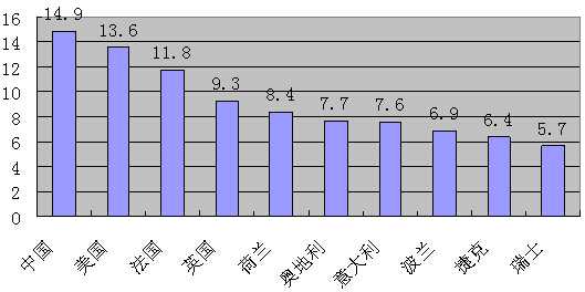 2014年中国首次成为德国电气电子工业的最大进口国——德国出口到中国的产值达到149亿欧元(同比增长16.1%)。居第二、第三位的是美国和法国,德国对其的出口额分别为136亿欧元(同比增长4.5%)和118亿欧元(同比增长2%)。紧随其后的是英国和荷兰,德国对其的出口额分别为93亿欧元(同比增长9.5%)和84亿欧元(11.5%)。在德国电气电子工业出口前十名的国家中,德国对波兰出口额的增速提高最为显著:2014年出口额为69亿欧元,同比增长28.3%;出口增速相对较慢的国家是意大利和瑞士:对意大利的出口额为76亿欧元(同比增长1.2%),瑞士为57亿欧元(同比增长0.0%)。