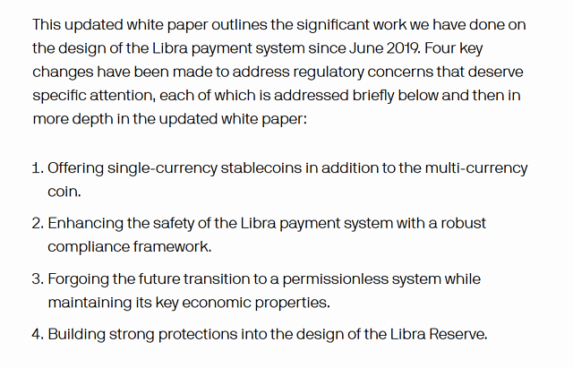Libra协会表示,在本次2.0版的白皮书中,为解决其被特别关注的监管问题,Libra项目已进行了四项关键更改:
