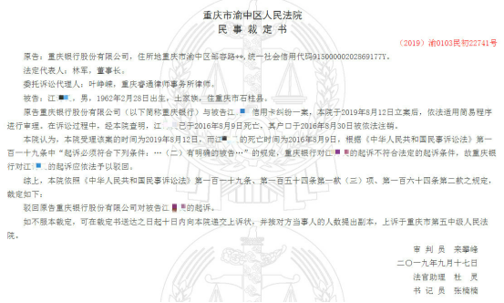 中国经济网北京12月5日讯 (记者 徐自立 马先震)伴随着信用制度的完善,信用卡越来越多的走进了人们的生活。在满足人们的消费需要的同时,也不可避免得使不少人因透支信用卡而有了一笔对银行的负债。因此,也不可避免的有人会因为各种原因没有及时偿还欠款而被银行追讨甚至起诉。近日,中国裁判文书网就披露了一起诉讼,重庆银行股份有限公司(以下简称“重庆银行”,BCQ,起诉了一名欠款未还的信用卡用户,不过,令人惊奇的是这位被告却被查明已经去世3年多。