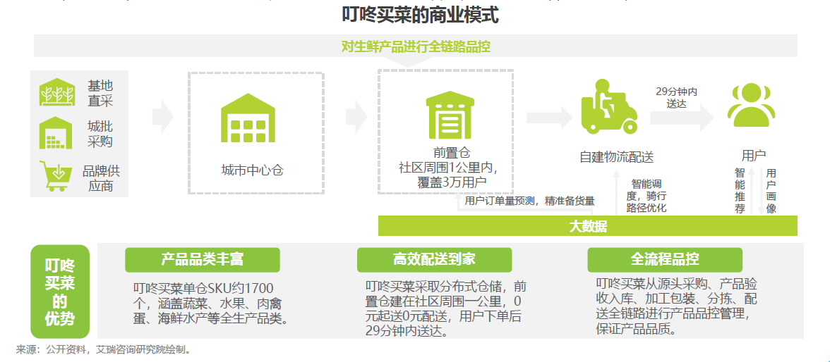 专注于前置仓模式的社区生鲜电商,叮咚买菜定位家庭买菜业务,以上海为核心城市,围绕一日三餐场景,以生鲜产品为主要品类,利用前置仓为消费者提供便捷、新鲜的生鲜到家服务。