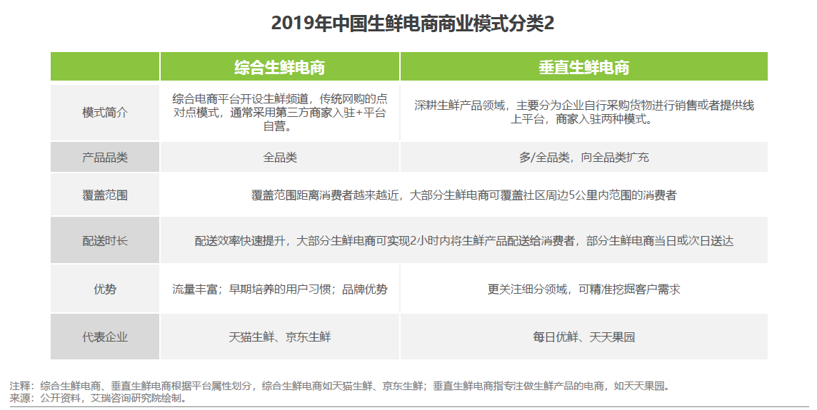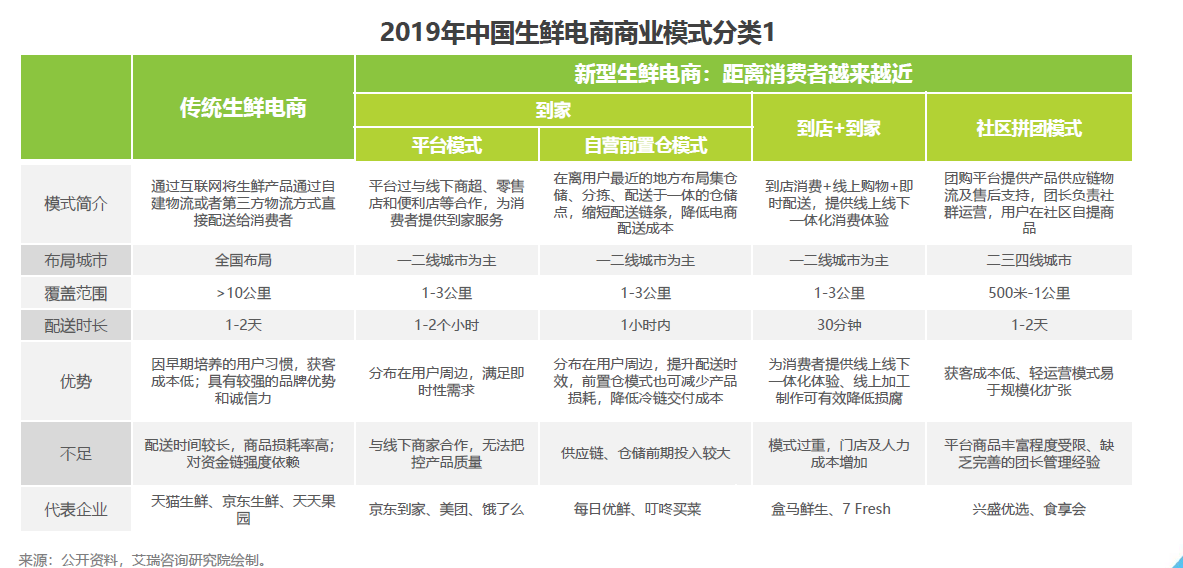 现阶段,除传统生鲜电商外,前置仓、 “超市+餐饮”、社区拼团等创新模式不断涌现,割据一方。目前还没有模式能够真正“称霸”生鲜电商市场,2019年生鲜电商多种商业模式并存的格局仍将继续。