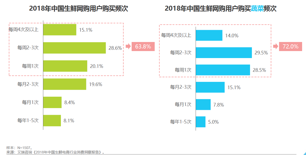 每周购买1次以上的生鲜网购用户占比达63.8%,每周购买2-3次占比为28.6%。72.0%的用户网购蔬菜的频次在每周1次以上,远高于整体购买生鲜频次。