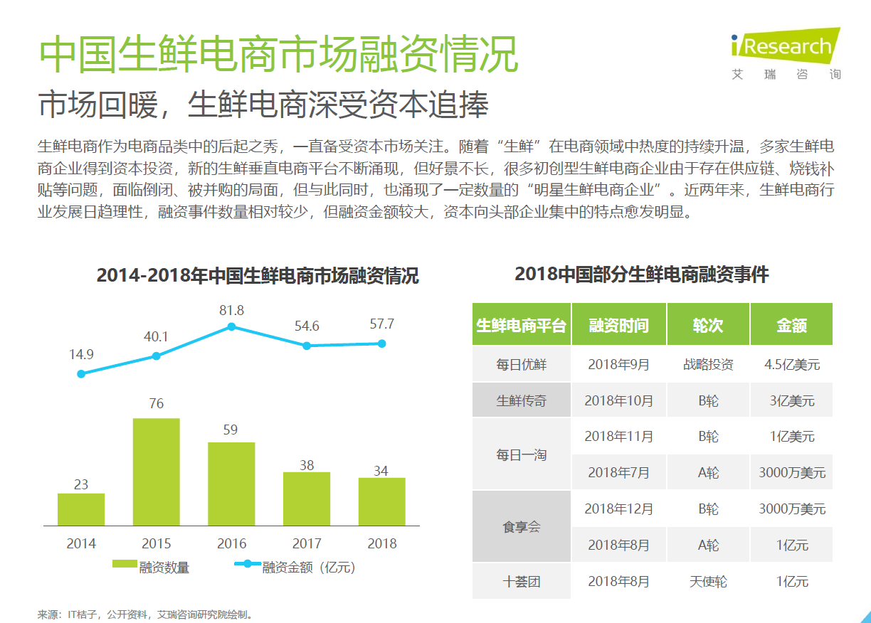 “生鲜”在电商领域中持续升温,多家生鲜电商企业得到资本投资。但很多初创型生鲜电商企业由于存在供应链、烧钱补贴等问题,面临倒闭、被并购的局面。与此同时,也涌现了不少“明星生鲜电商企业”。生鲜电商发展日趋理性,融资事件相对较少但金额较大,资本向头部企业集中的特点愈发明显。