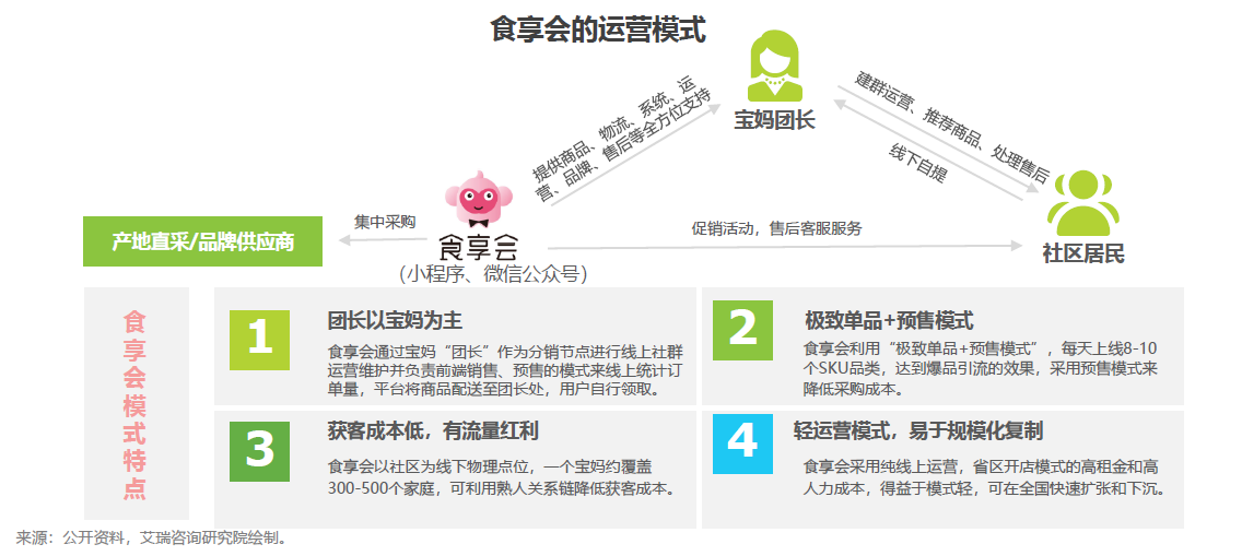 成立于2017年12月,由生鲜品类切入“家庭消费场景”,是基于社区拼团模式的生鲜电商。社区拼团模式即以社区为中心,由团长线上建立社群,团长每天在微信群推送8-10款商品进行预售,所有订单集中成为一个大订单,由供应商发货直接配送到小区,然后由团长分发到小区消费者手中。截至2019年1月,食享会的销售网已覆盖全国15省45个城市近2万个小区,拥有团长近2万人。