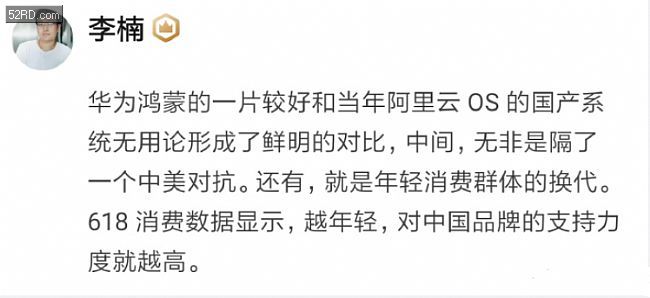 魅族前副总李楠也在知乎上发表了自己对鸿蒙OS的评价:华为鸿蒙的一片叫好和当年阿里云OS的国产系统无用论形成了鲜明对比。还有618消费数据显示,越年轻对中国品牌的支持力度就越高。