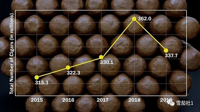 2018年,美国雪茄进口创造20年来的新高,使得美国雪茄进口量接近3.62亿支。这是上世纪90年代雪茄繁荣时期以来从未出现过的。一些市场领袖认为,2018年的数据并不代表实际销售,而是对其他因素的反应。