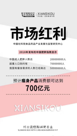 中国的瘦身市场有多大?告诉你一组数据,我国成人肥胖人口约多达2亿,超重人口则约有7000万。每10个人中至少有7人有瘦身需求,尤其是今年春节,平均每人都胖了5斤。马上夏天就要来了,人人都想瘦身,现在正是一个巨大的风口,预计瘦身产品消费额可达到700亿,中国大健康产业迈入了蓝海时代,市场上的瘦身产品鱼龙混杂,选择一款健康有效销量又好的产品至关重要!纤丝蔻就是你一直在寻找的产品!纤丝蔻草本中药减肥套盒是第一款不健身运动,不服用,抹一抹,就能瘦的新产品,销售市场空白页,等着你占领!