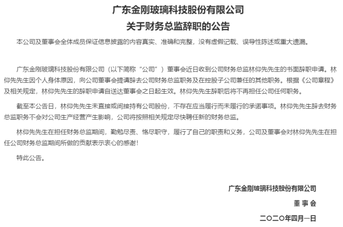 不过,今年4月1日,金刚玻璃发布公告称,林仰先因个人身体原因,向公司董事会提请辞去公司财务总监职务及在控股子公司兼任的其他职务。根据《公司章程》及相关规定,林仰先的辞职申请自送达董事会之日起生效,辞职后将不再担任公司任何职务。