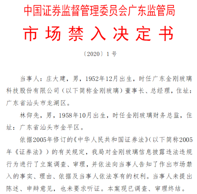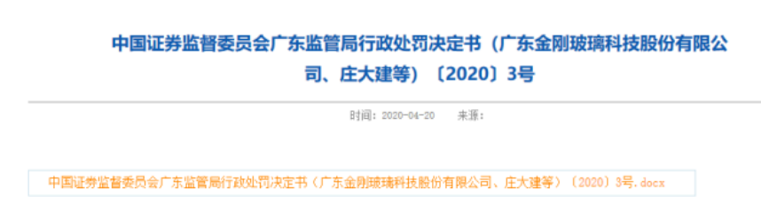 4月20日,广东证监局对金刚玻璃下发《行政处罚决定书》和《市场禁入决定书》。经查,2015年至2018年间,金刚玻璃存在虚增营收、利润、货币资金以及未按规定披露关联交易等违法行为。根据《证券法》规定,广东证监局决定对金刚玻璃责令改正并给予警告,同时处以60万元罚款;与此同时,公司时任董事长庄大建、财务总监林仰先等24名相关责任人共计被罚款158万元。其中,庄大建和林仰先分别被采取10年和5年的证券市场禁入措施。