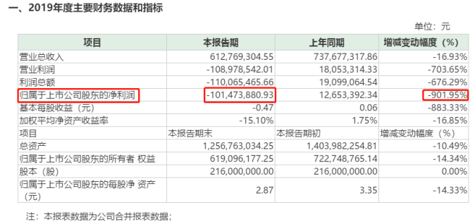 来看看公司业绩。2019年,公司业绩快报显示,公司去年营业收入6.13亿元,同比下降16.93%;实现归属上市公司股东的净利润为负数,达-1.01亿元,同比大幅减少901.95%。