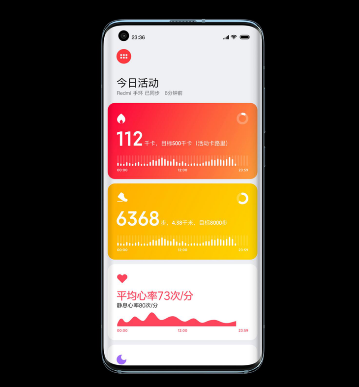 在健康方面,Redmi手环支持24小时心率监测,包括静态、动态和全天心率监测,可以即时查看心率,进行高心率预警。它也支持夜间睡眠监测,能够准确记录睡眠时间、帮助记录睡眠质量,通过小米穿戴APP可以看到各项数据,进行科学的睡眠分析。Redmi手环也加入了久坐提醒功能,当久坐办公时手环会轻轻振动,提醒用户起来活动。