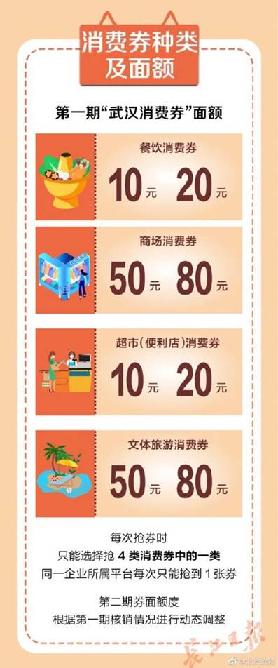 据央视报道,为活跃消费市场、支持复工复产,4月19日起至7月31日,武汉市政府将陆续向全体在汉人员投放5亿元的“武汉消费券”。包含餐饮消费券、商场消费券、超市(便利店)消费券和文体旅游消费券。首次抢券将在19日中午12:00进行;也将面向低保、特困和建档立卡贫困人口设置约1800万元的专用消费券,实行定向发放。