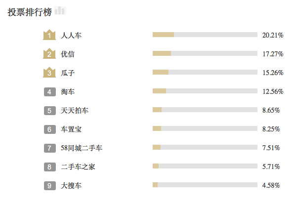 作为一个风口行业,二手车今年备受各界关注,“年度值得信赖二手车平台”的角逐尤为激烈,入围品牌几乎涵盖了目前国内所有的主流二手车电商平台。人人车作为汽车交易服务领域的代表企业,凭借领先的产品服务体验,获得用户和专家评审一致认可。