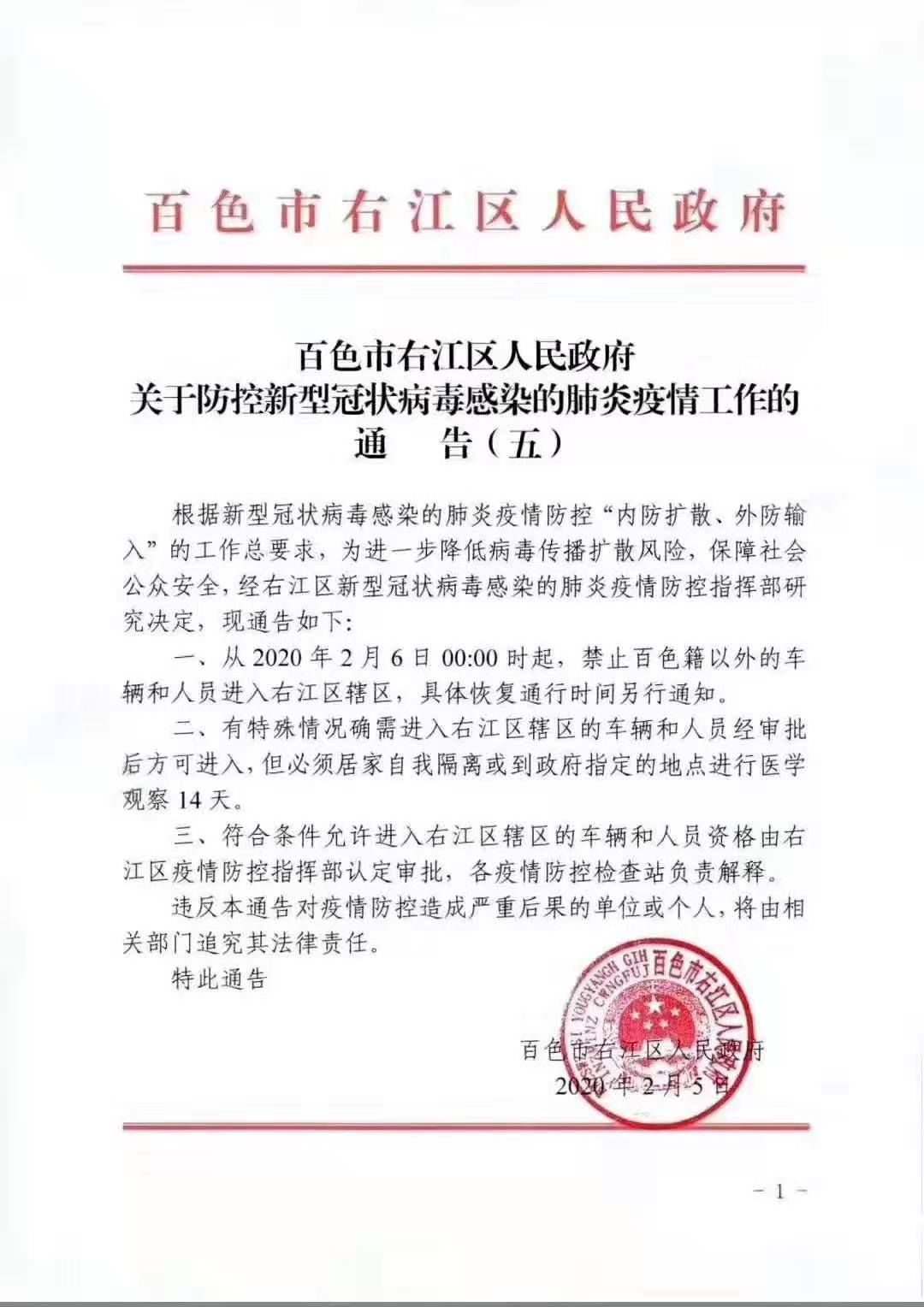 一、从2020年2月6日00:00时起,禁止百色籍以外的车辆和人员进入右江区辖区,具体恢复通行时间另行通知。