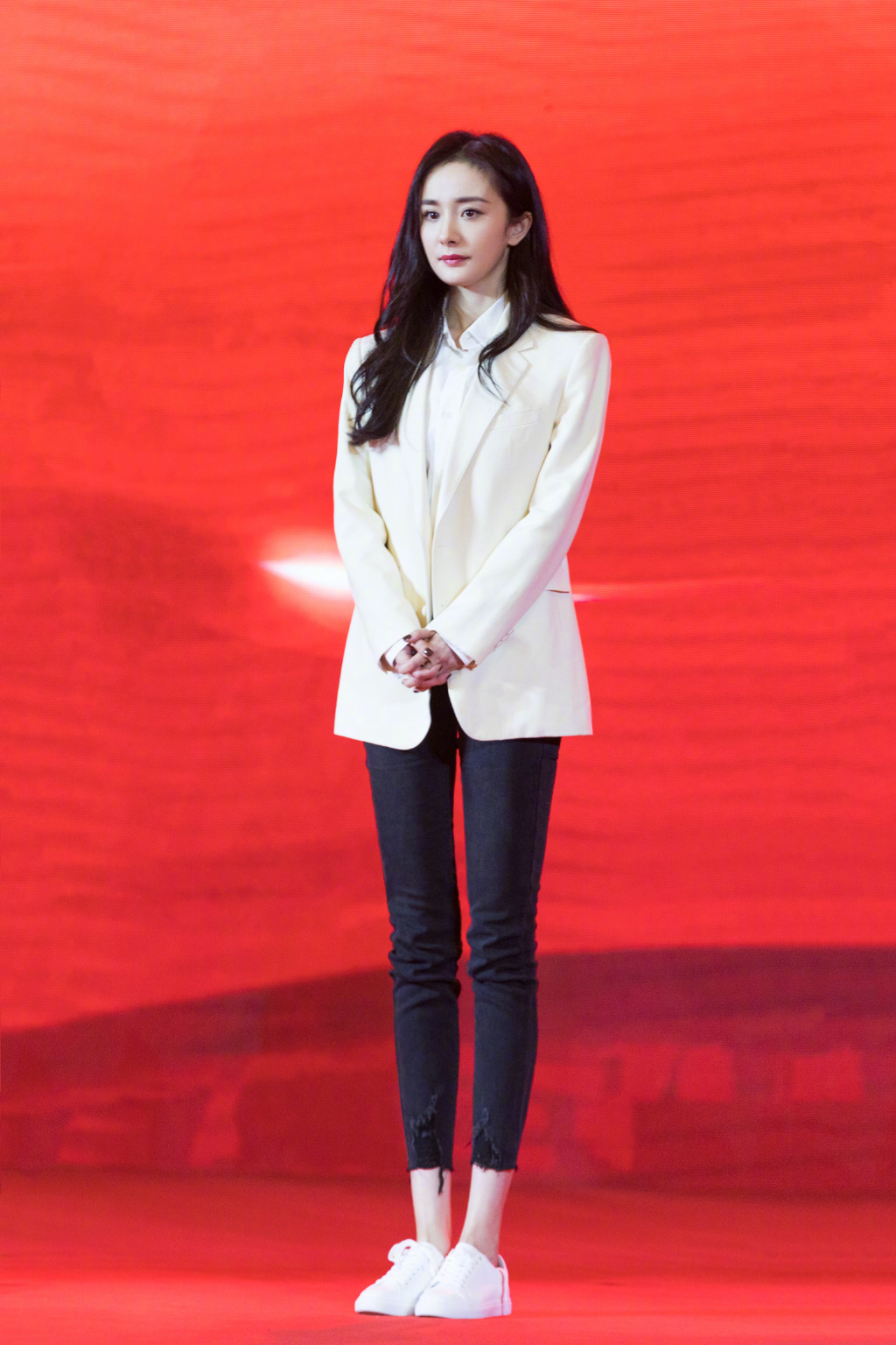 这次杨幂用的是一款卷发造型搭配上白色的西服外套,内搭一件白色的白衬衫,一款九分牛仔裤,脚上踩着一双白色的休闲白鞋,秀出了她完美的身材,高雅清爽大气,美不胜收。小蛮腰实力抢眼又抢镜,同时杨幂的小鸟腿也是非常的好看,不得不说太美了点吧。
